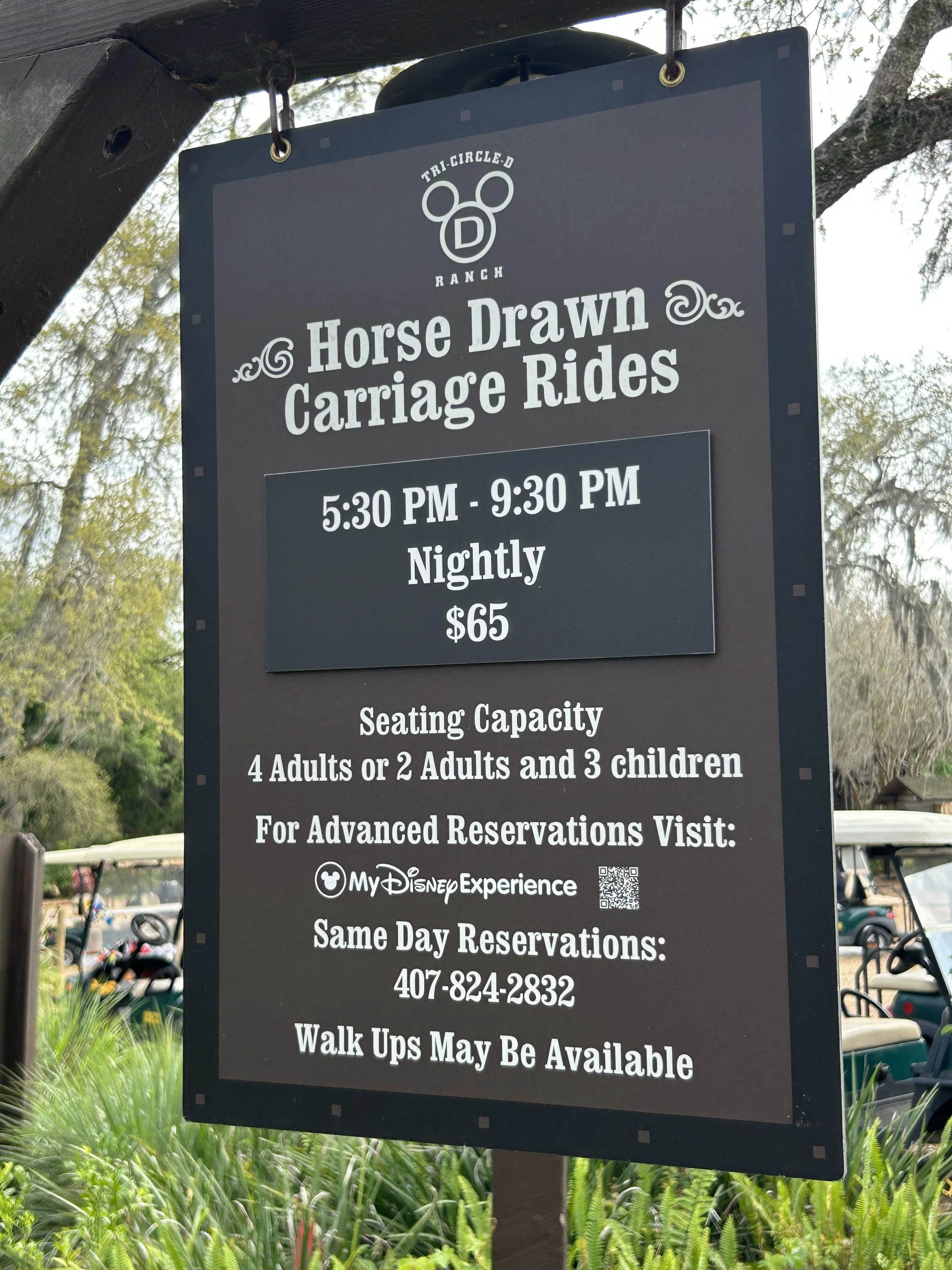 Go for a 25 minute horse-drawn carriage ride through Fort Wilderness Resort & Campground. Fits up to 4 adults, or 2 adults and 3 small children. Carriage Rides are also offer at Port Orleans Resort – Riverside.